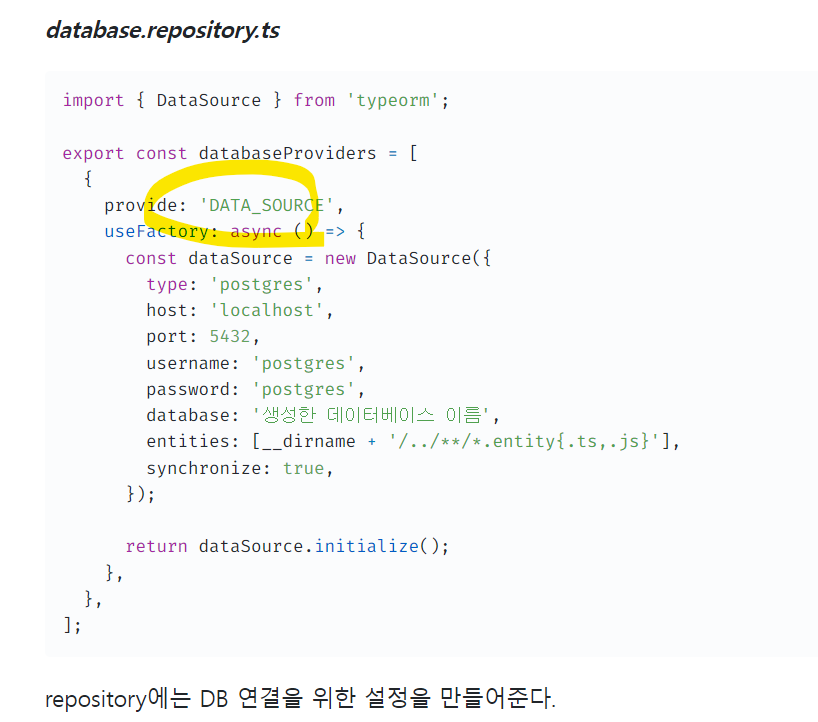 - module에 DataSource를 직접 생성하여 provider로 직접 'DATA_SOURCE'라는 문자열을 등록한다.
