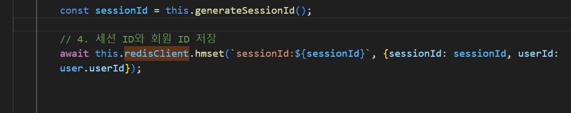 redisClient에 세션 ID를 넣어주는 코드를 작성하던 중 오류가 발생하였다.