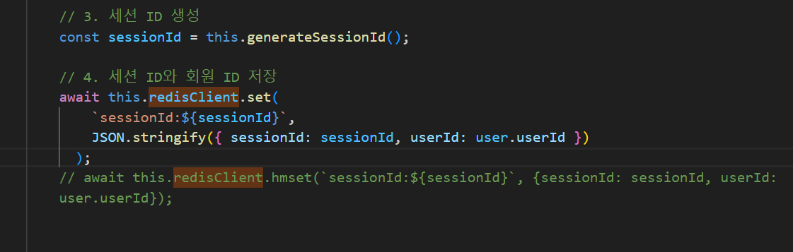 redisClient에 세션 ID를 넣어주는 코드를 작성하던 중 오류가 발생하였다.