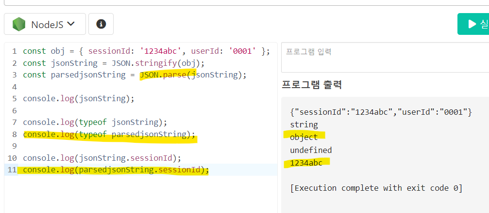 - 속성 액세스: JSON.parse를 통해 자바스크립트 개체로 변환해야 해당 문자열이 Object로 인식되어서 속성에 접근이 가능하다.