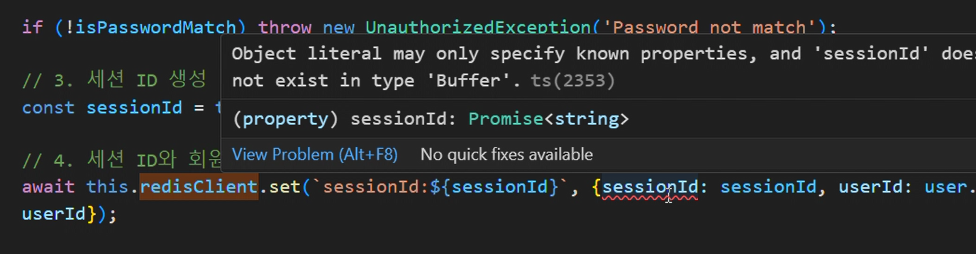 - Redis는 string이나 buffer타입만 인식하는데, 내가 쓴 코드에서 sessionId는 promise<string>이기 때문에 이게 string이 아닌 buffer로 인식되고 있다.