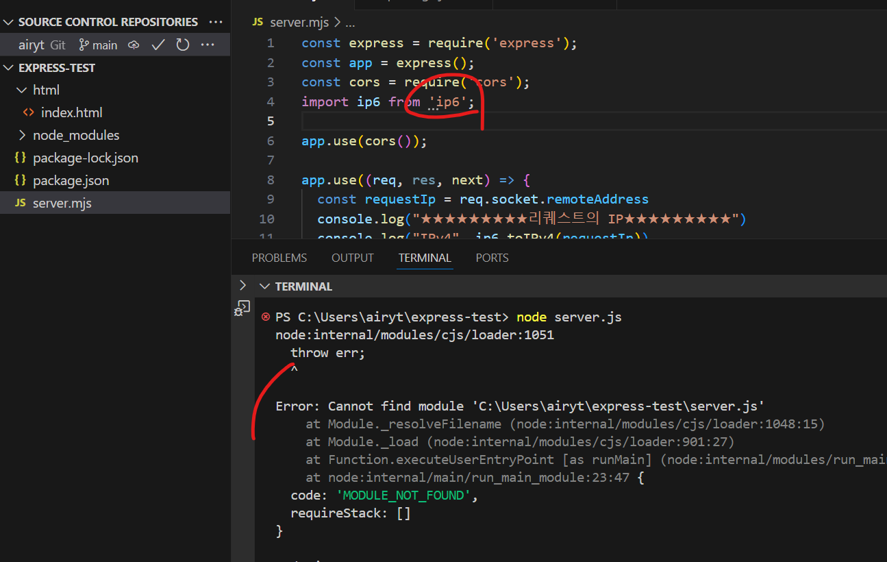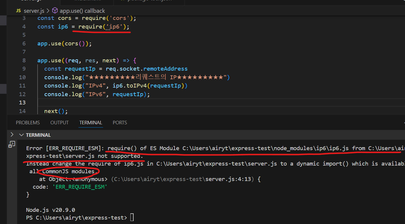 Error [ERR_REQUIRE_ESM]: require() of ES Module C:\Users\airyt\express-test\node_modules\ip6\ip6.js from C:\Users\airyt\express-test\server.js not supported.