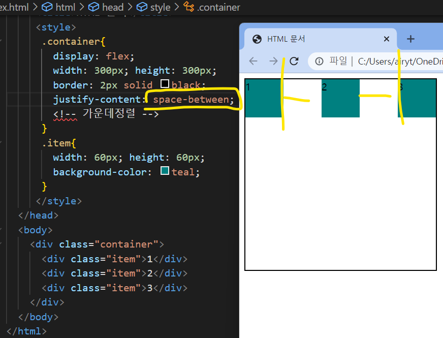 justify-content: space-between; (주축에서 양끝 요소들 끝에 고정시킨 후 사이 여백을 동일하게 맞춤)