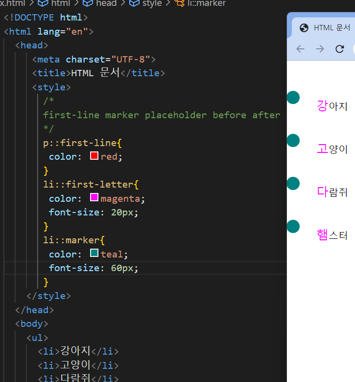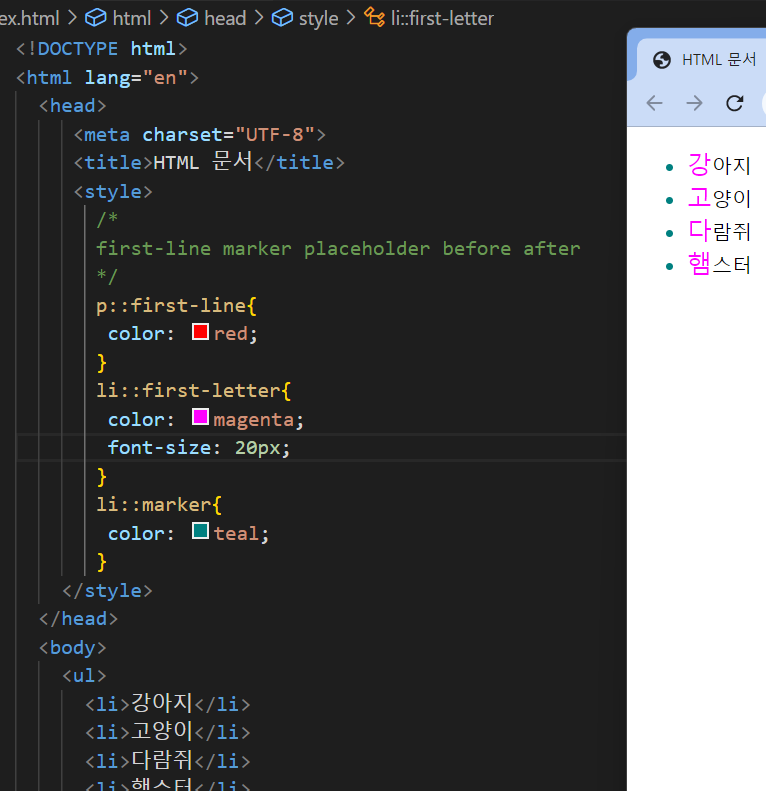 -> li 요소의 첫 번째 글자만 크기를 20px로 하겠다(기본값은 16px)