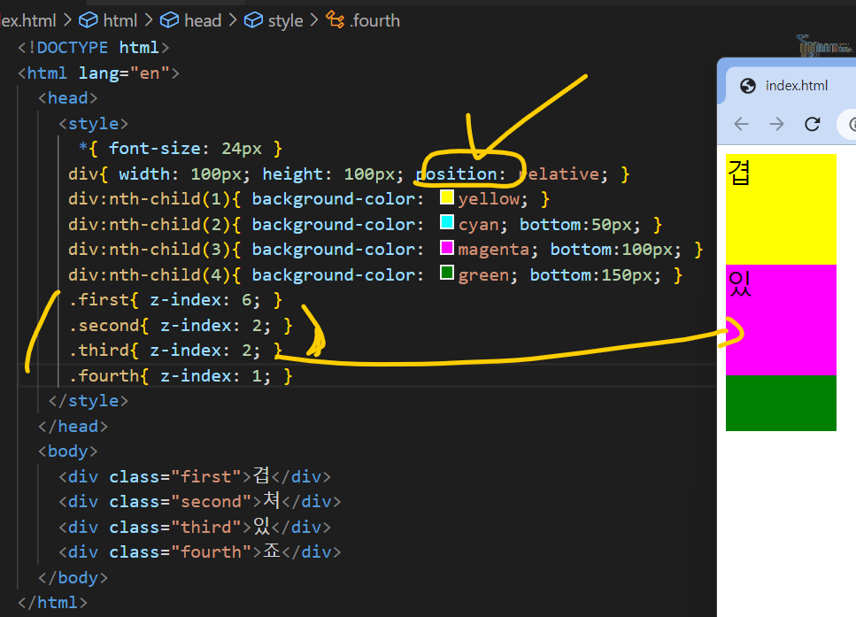 z-index가 같으면 나중에 생성된 요소가 더 위에 쌓이게 됨.