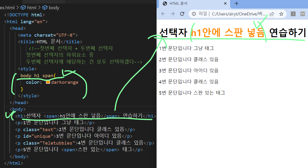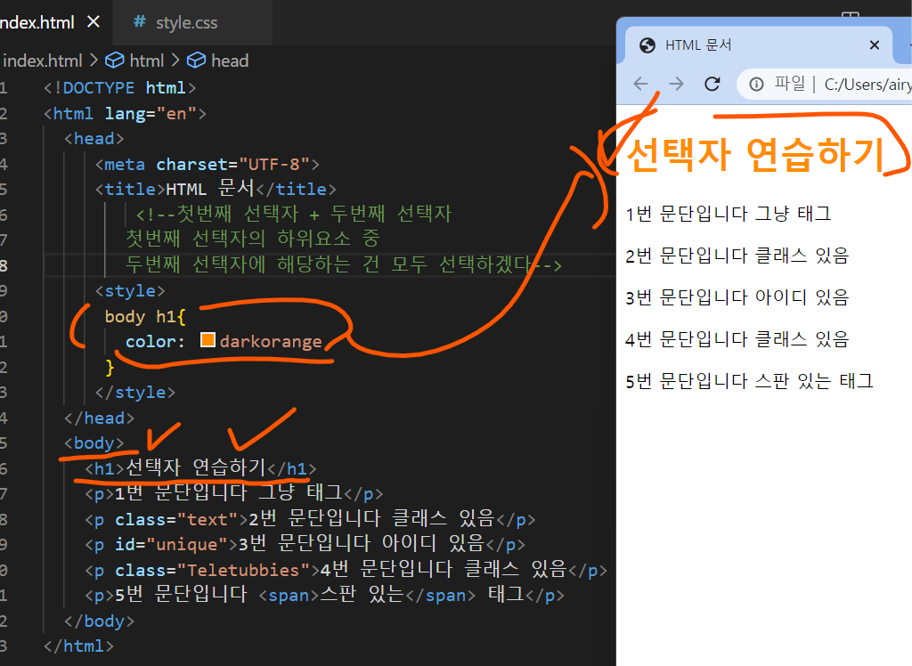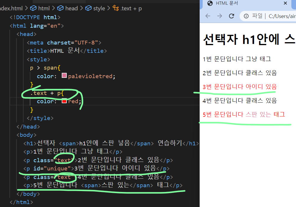 h1 + p{ color: red; } ----> h1 요소의 바로 뒤에 오는 형제 p요소를 선택하기