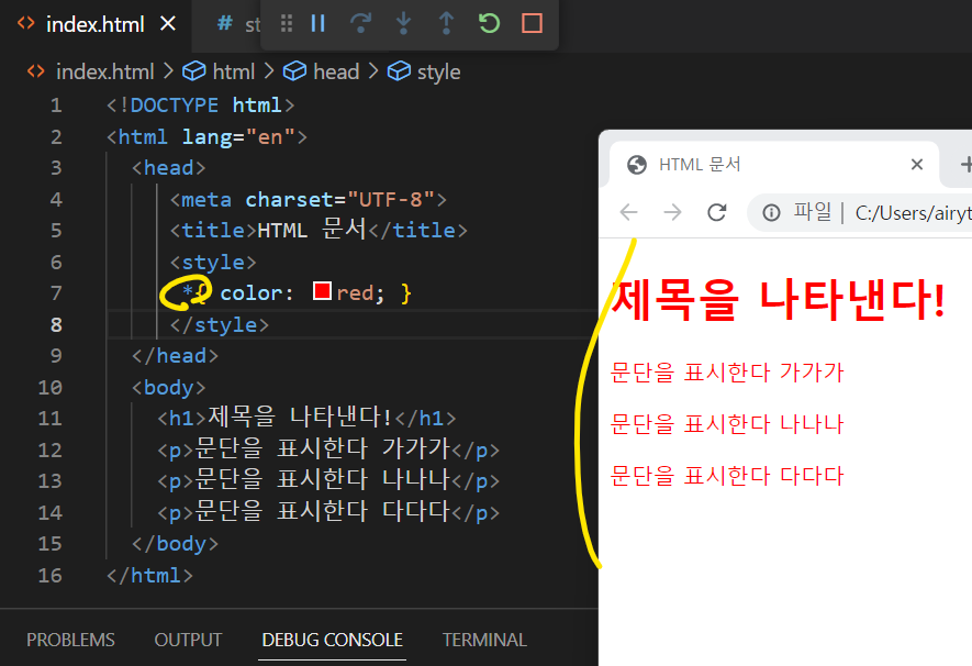 • 속성명 : color를 정의하겠다. 이건 글자색을 의미한다.