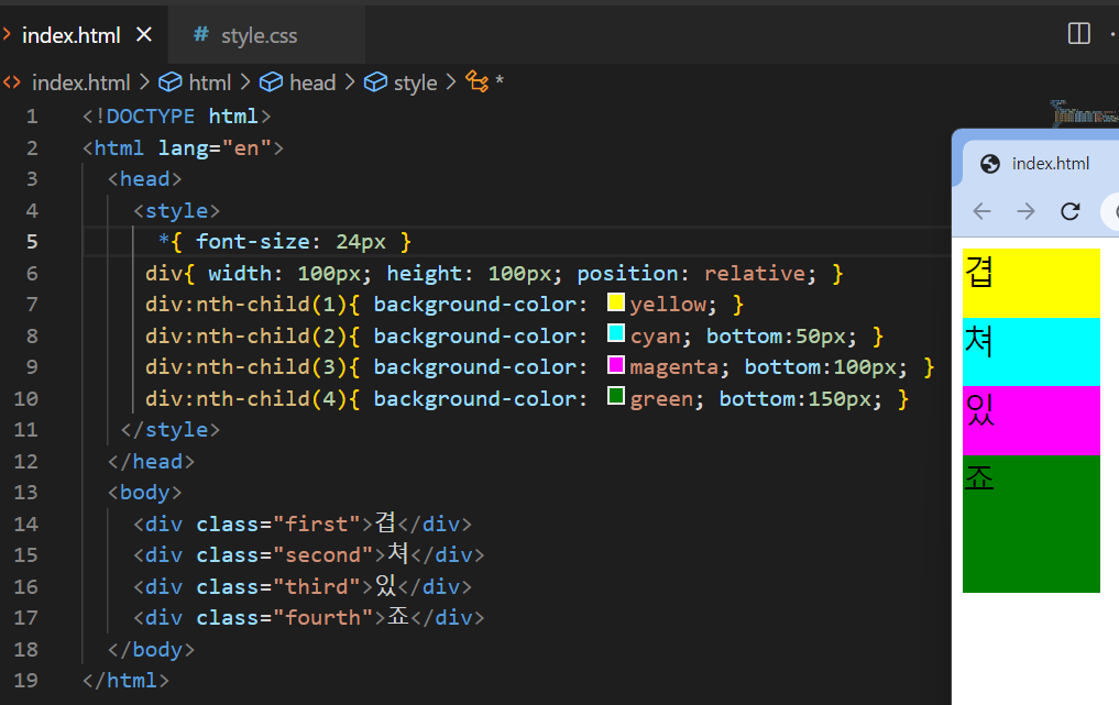 '쳐'가 '겹'보다 더 위에 쌓임.