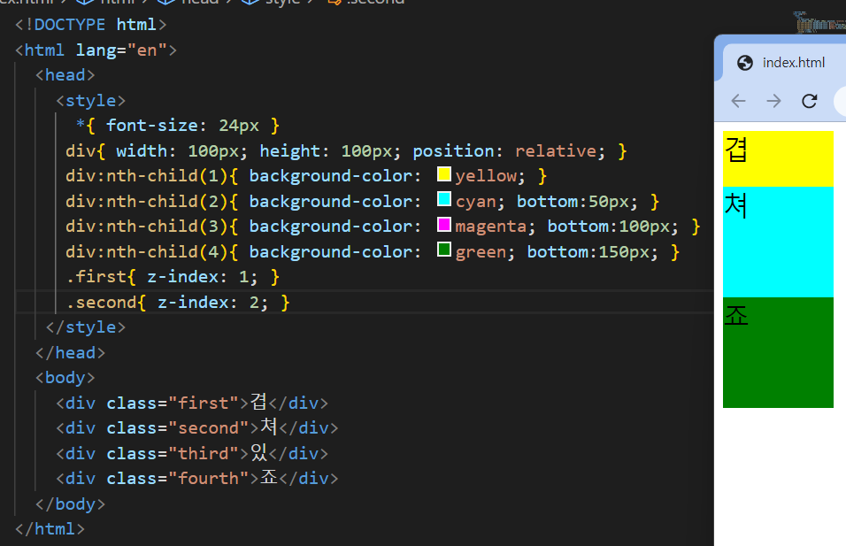 '겹'이라고 써있는 first class 요소가 더 위에 쌓임