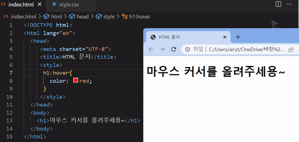 -> h1 요소에 마우스 커서가 올라오면(hover) 글자를 빨간색으로 하겠다.