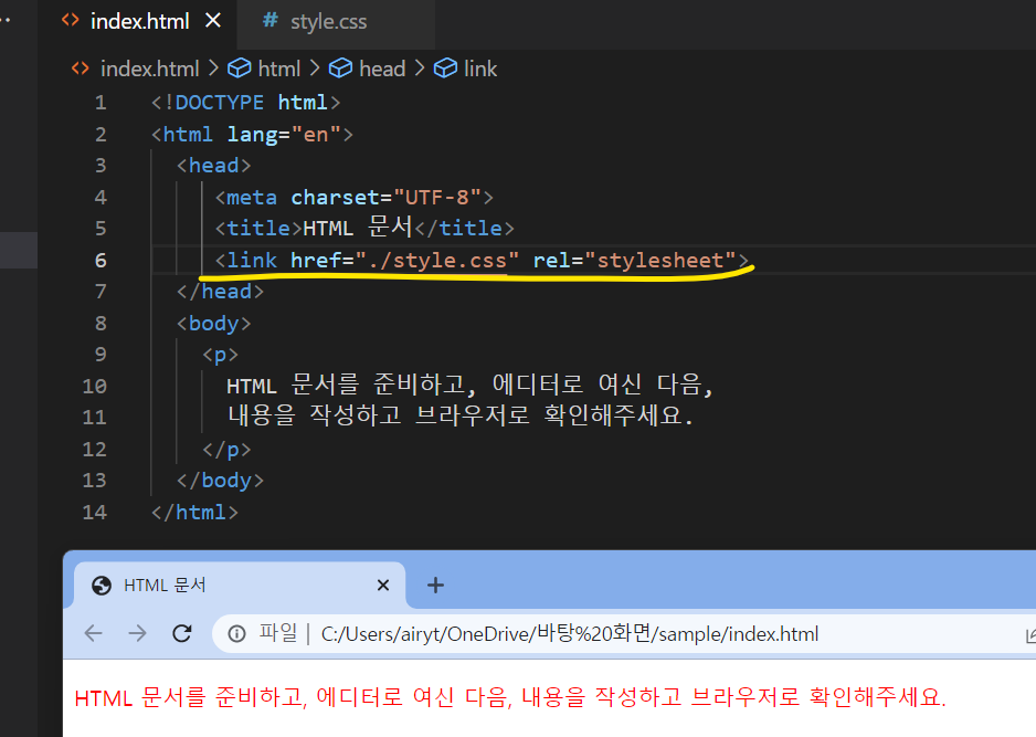 • 문서 간의 연결 : 스타일시트 문서를 따로 작성하여 HTML 문서와 연결하기