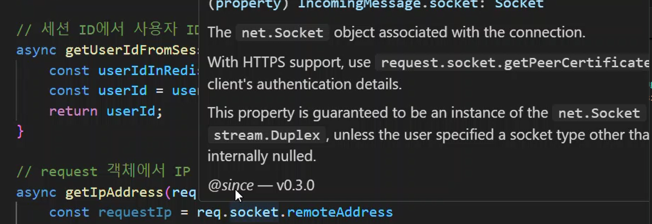 @nestjs/common에서 제공하는 Request를 불러오면 request.socket 속성을 사용할 수 없다.