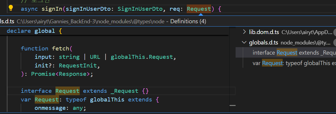 이번 프로젝트에서도 express의 Request 객체를 불러와야 하는 상황이 발생하였다.