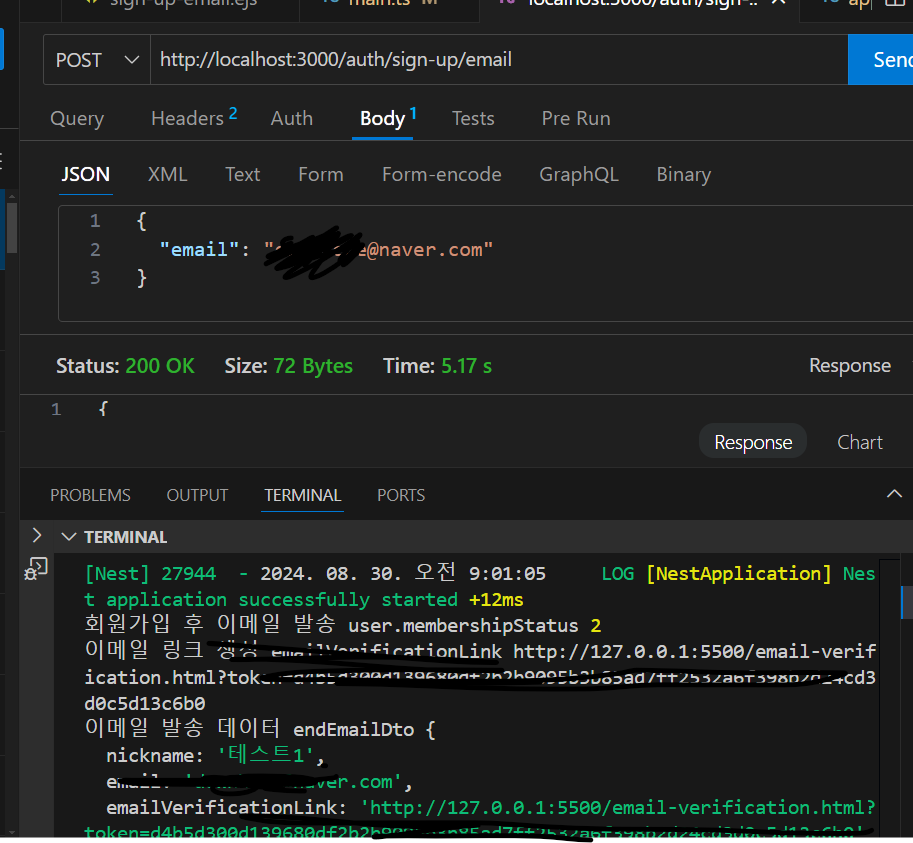 Thunder Client로 메일을 발송하였다.