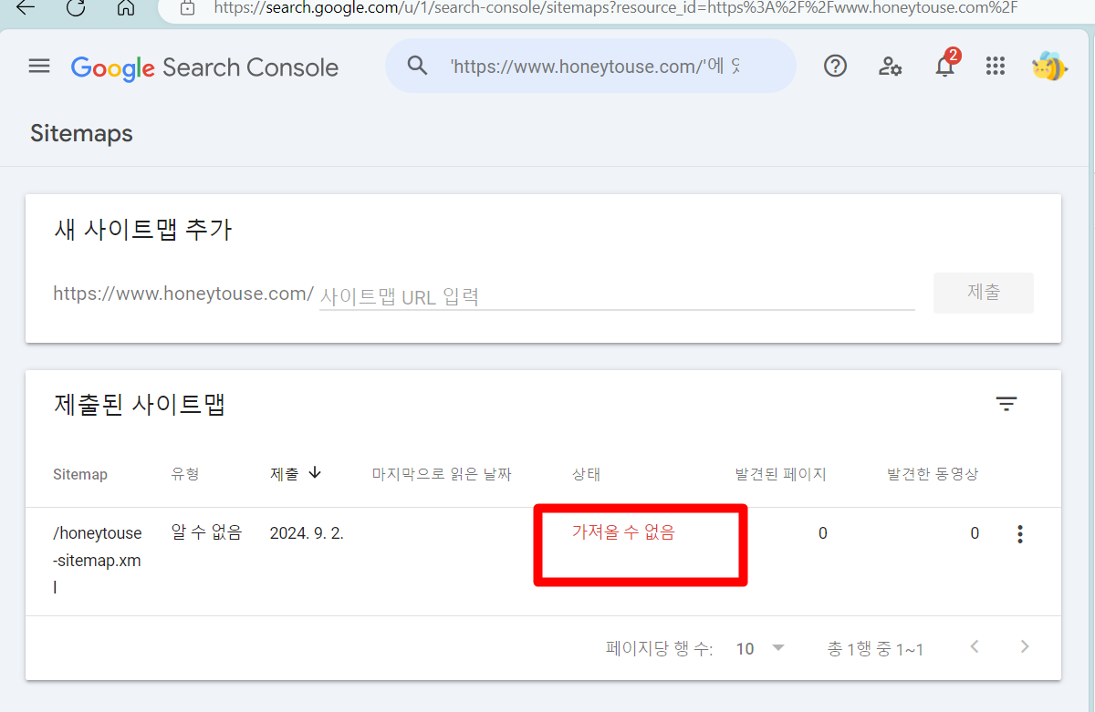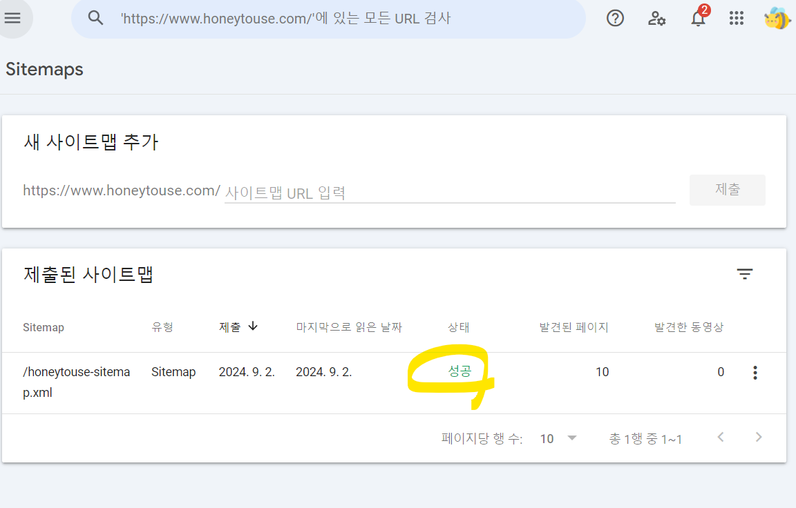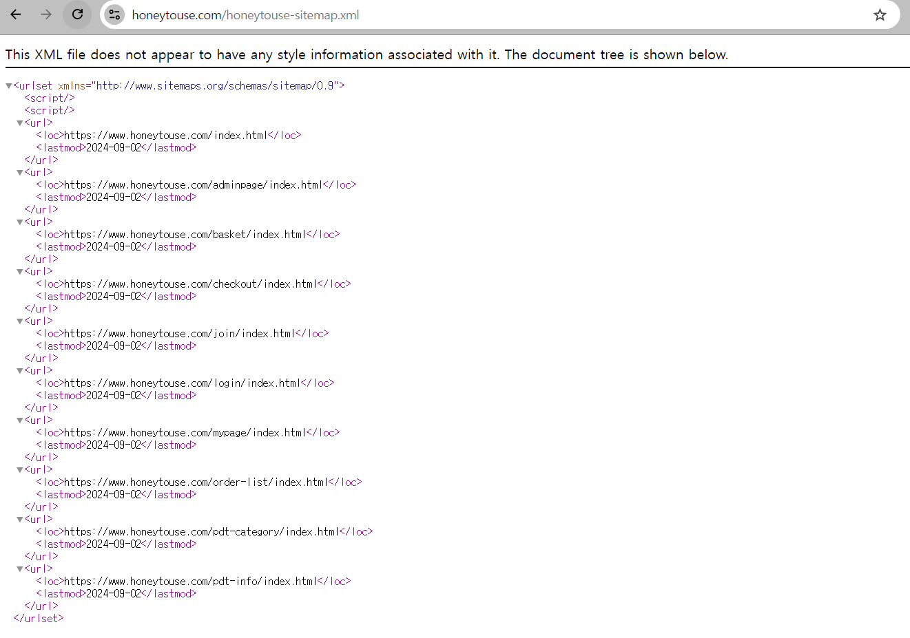 우리 사이트 도메인에 이 honeytouse-sitemap.xml을 입력했을 때 xml파일이 나온다면 잘 설정된 것이다.