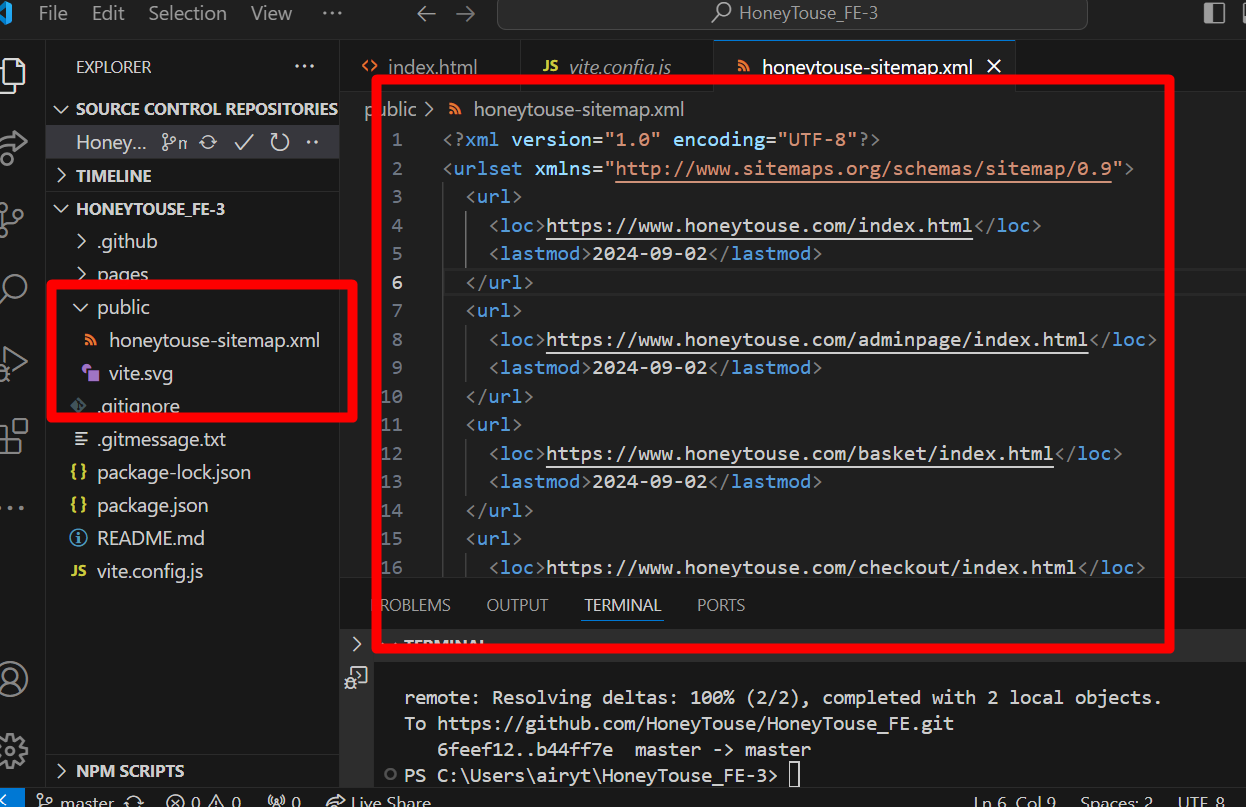 그냥 마우스 드래그로 파일을 생성하였다. 'honeytouse-sitemap.xml'이라는 파일을 public 폴더 안에 생성하였다.