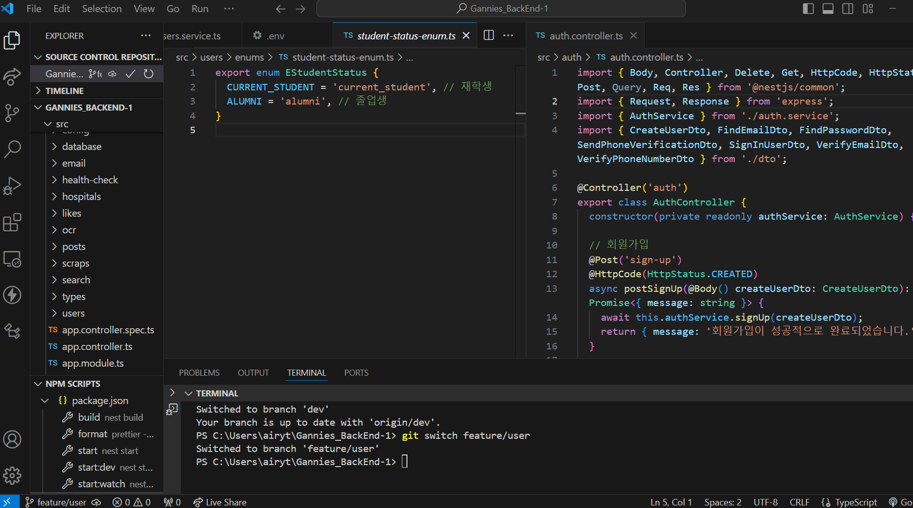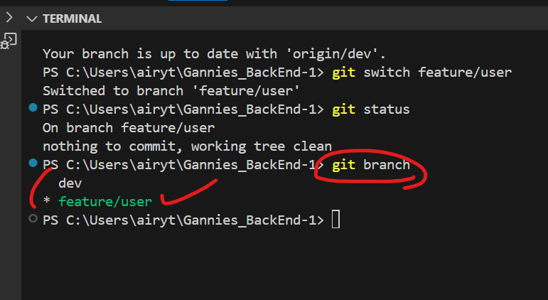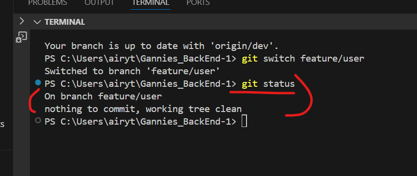 - 내가 feature/user을 새로 만들어서 작업하고 커밋을 했음.