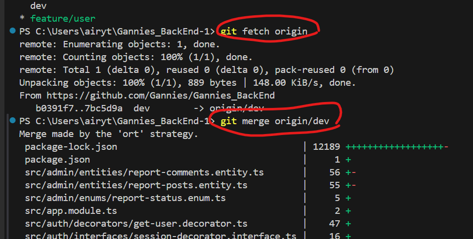 그리고 git merge origin/dev로 원격 저장소에 있는 dev의 최신 사항을 합친다.