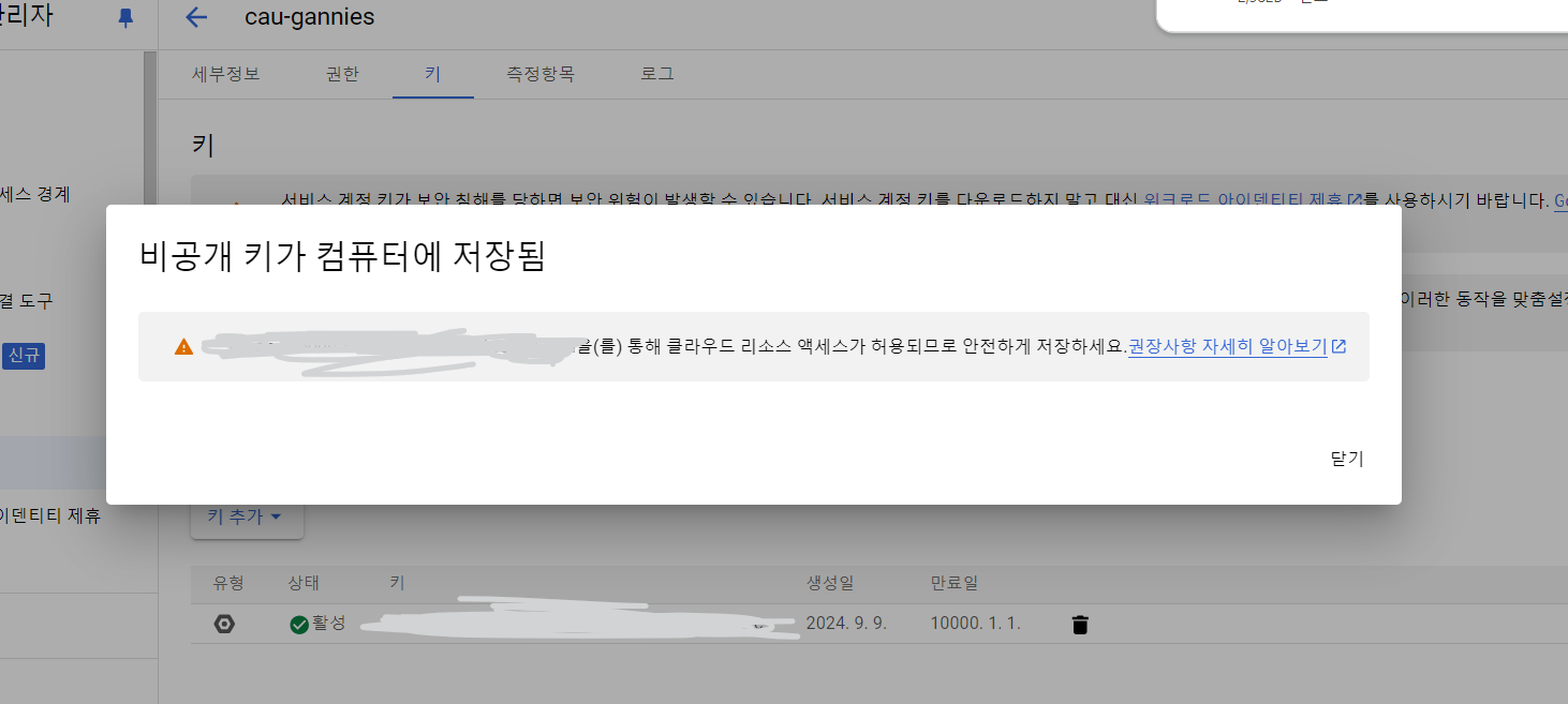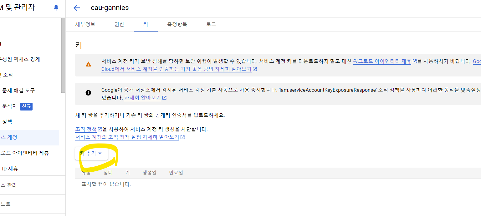 '키 추가'를 눌러서 JSON 파일을 다운 받아야 한다.