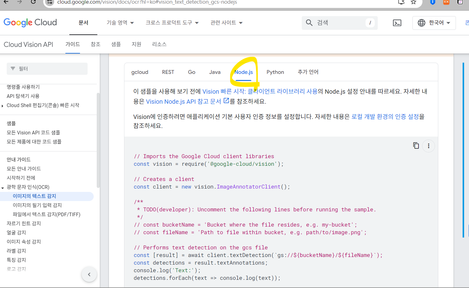 구글 클라우드 문서를 보면 Node.js에서 이 OCR API를 어떻게 활용하는지에 대한 설명이 나와있다.