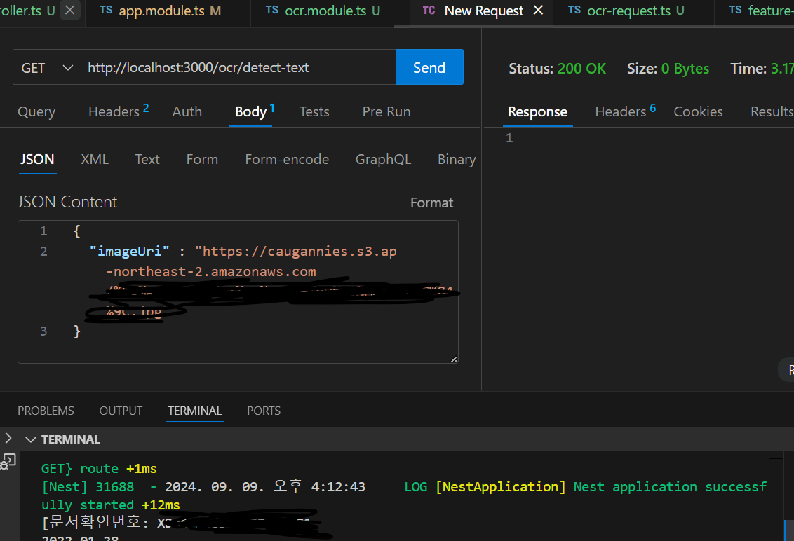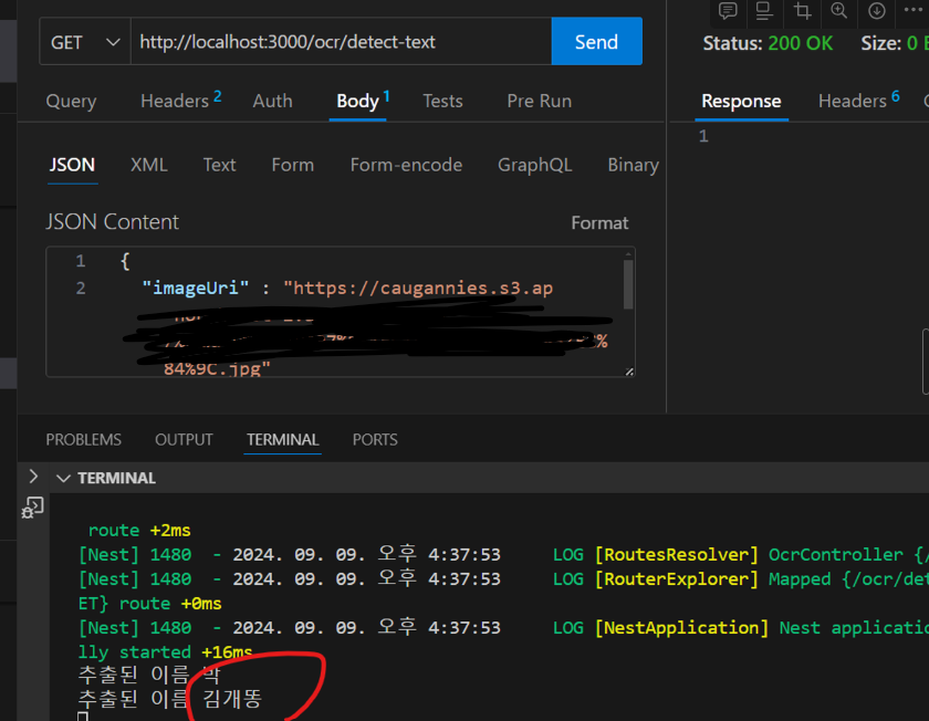 S3 버킷에 있는 이미지 URI를 body값으로 넣고 OCR이 잘 작동하는지 테스트를 해보았다.