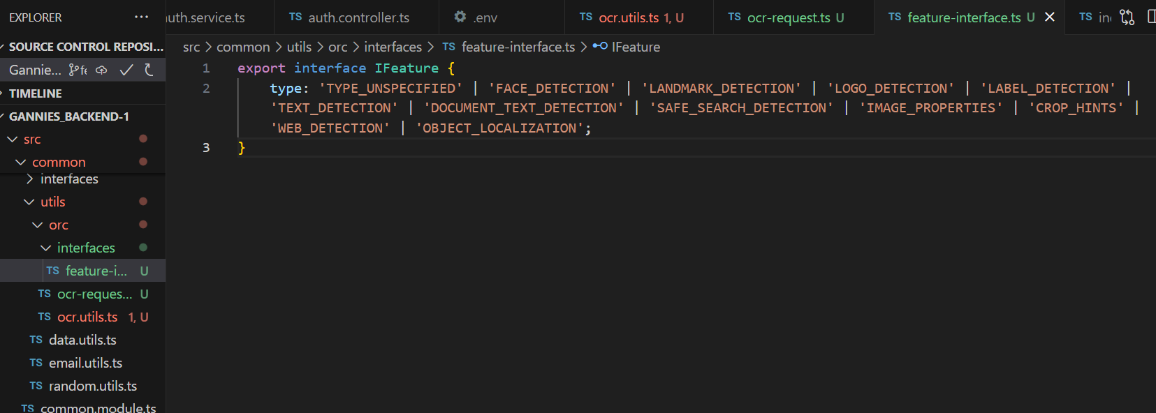 읽어보니까 type 'string'이 IFeature 인터페이스에 있는 타입이 아니라는 메시지가 떴다.