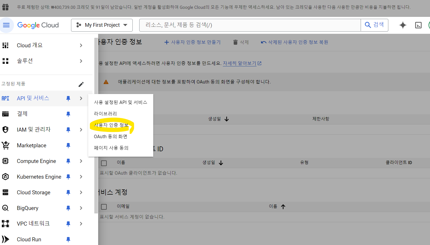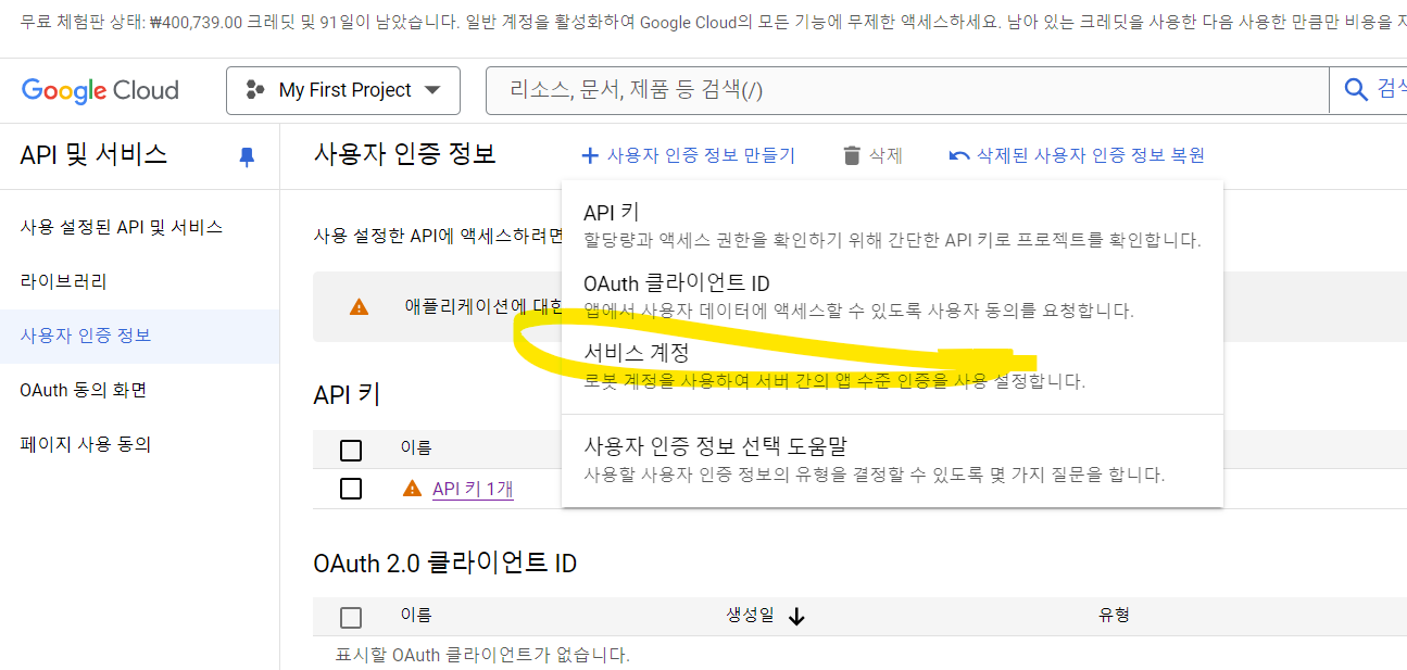 누르면 'API 키', 'OAuth 클라이언트 ID', '서비스 계정'이 있다.