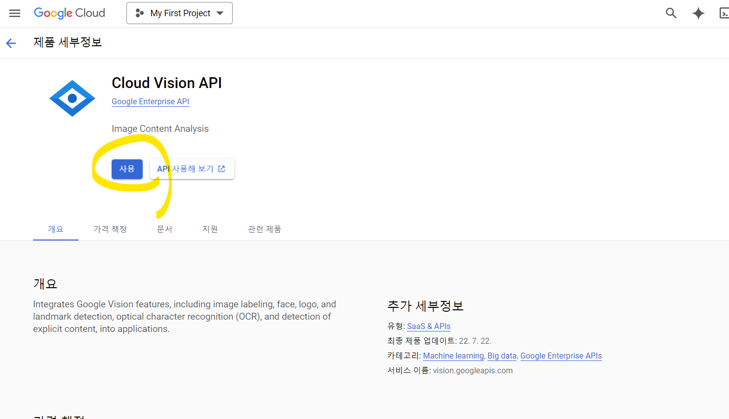 Cloud Vision API 세부정보에서 '사용'을 누른다.