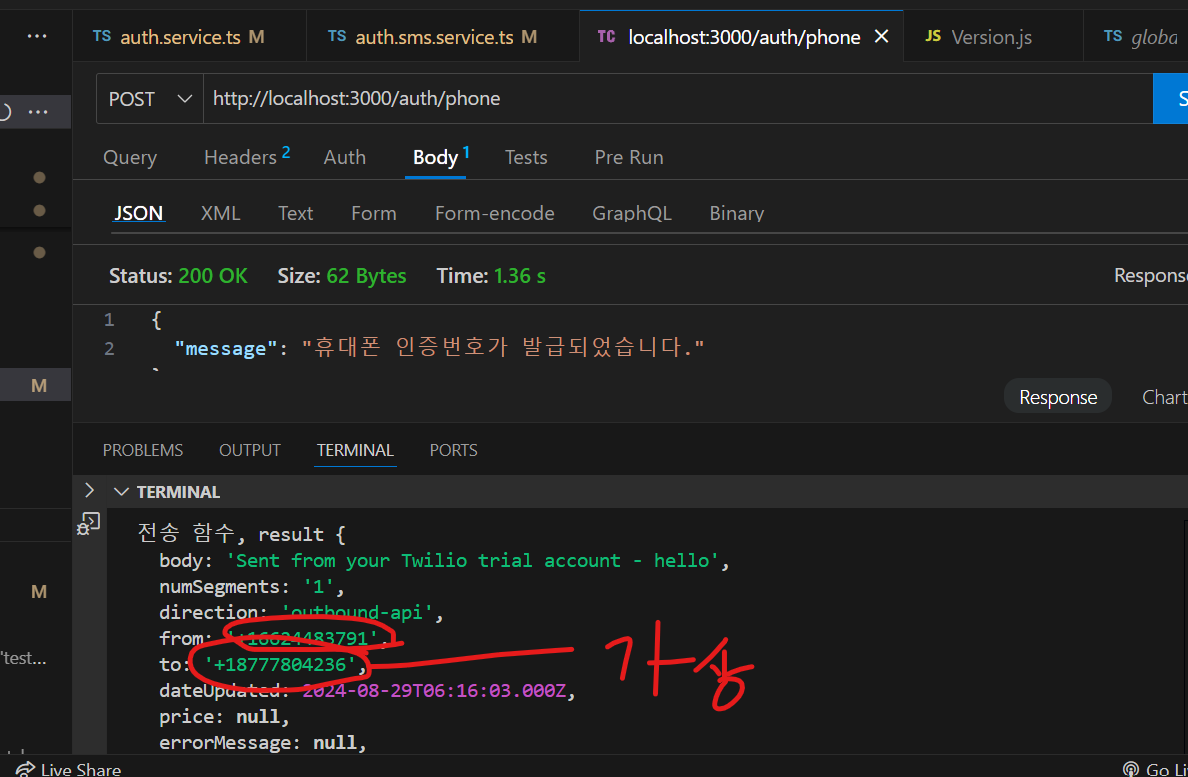 맨 처음에는 Verify가 아닌 SMS 서비스를 사용했는데, 이런 문제가 발생하니까 내 서버 코드가 문제인가 싶어서 Verify로 구현을 하였다.