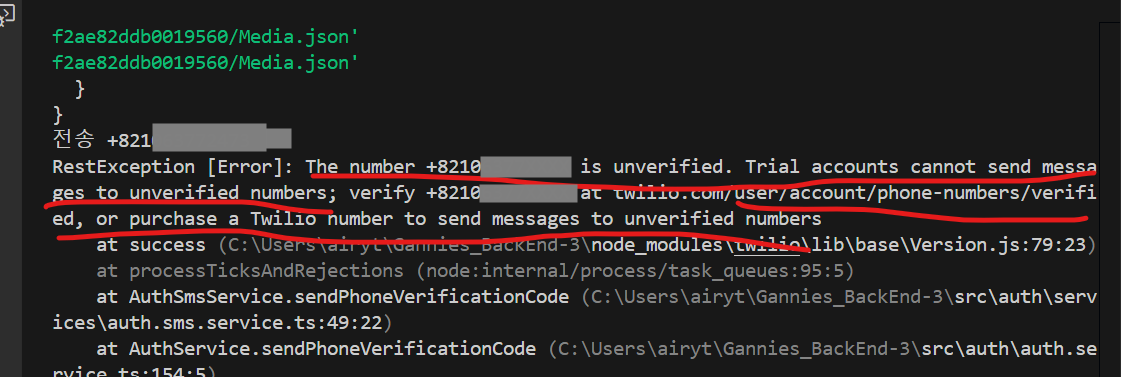 하지만 나의 경우에는 verified callers로 등록되어 있는 번호에 전송을 하였음에도 계속 트윌리오 서버에서 에러를 던져주었다.
