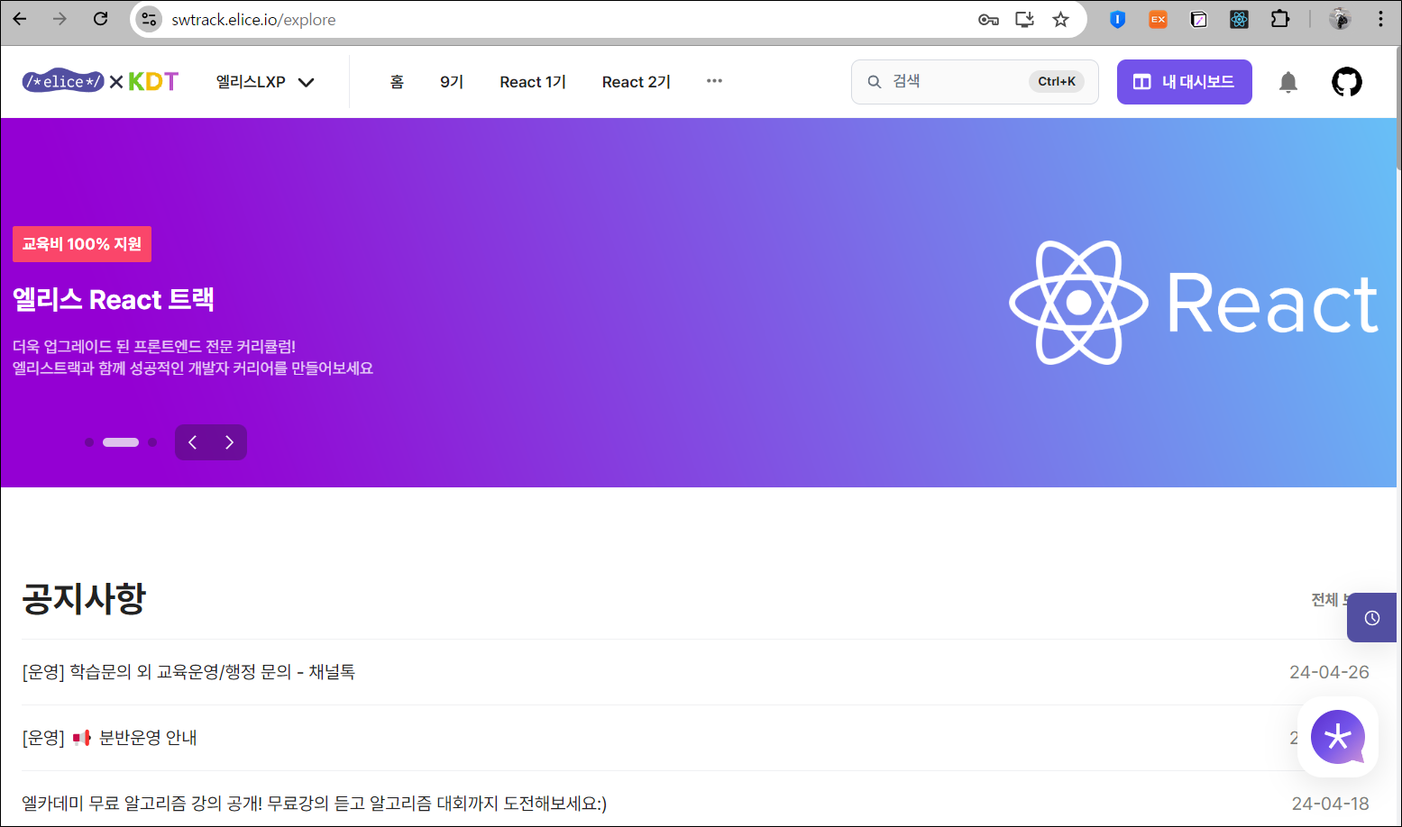 작년 하반기부터는 React 트랙, Node 트랙, 자율주행 트랙 등으로 세분화해서 운영된다고 한다.