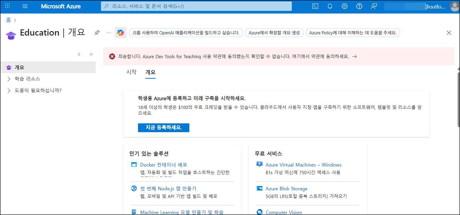 이후 방송대 계정으로 다시 학생 인증을 시도하니 정상적으로 Azure 학생 플랜이 등록되었다.