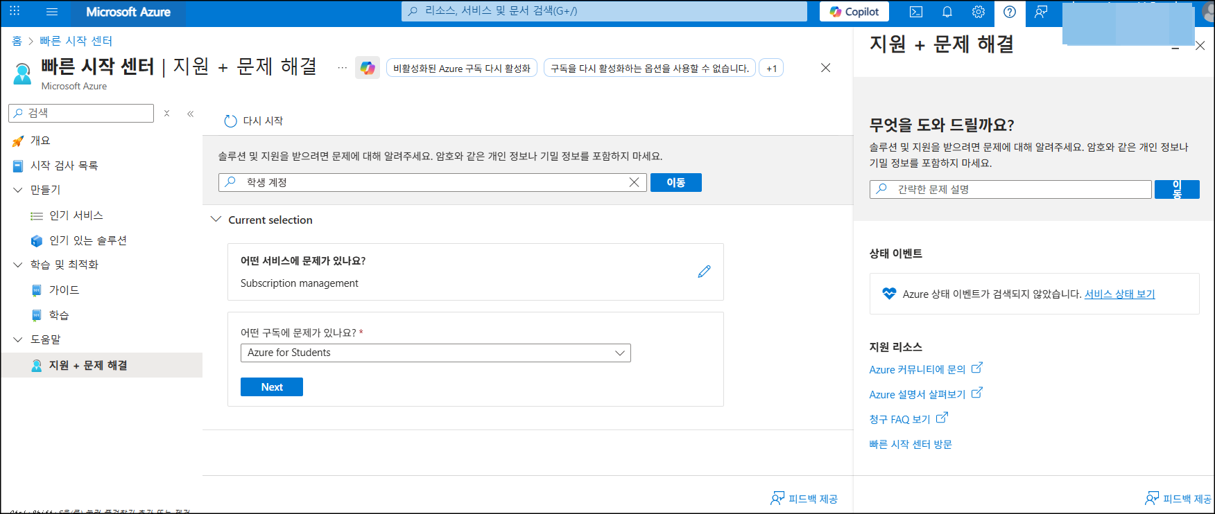 계정 생성 후 Azure 학생용 구독에 어려움을 겪은 학생들에게 하는 공지사항.