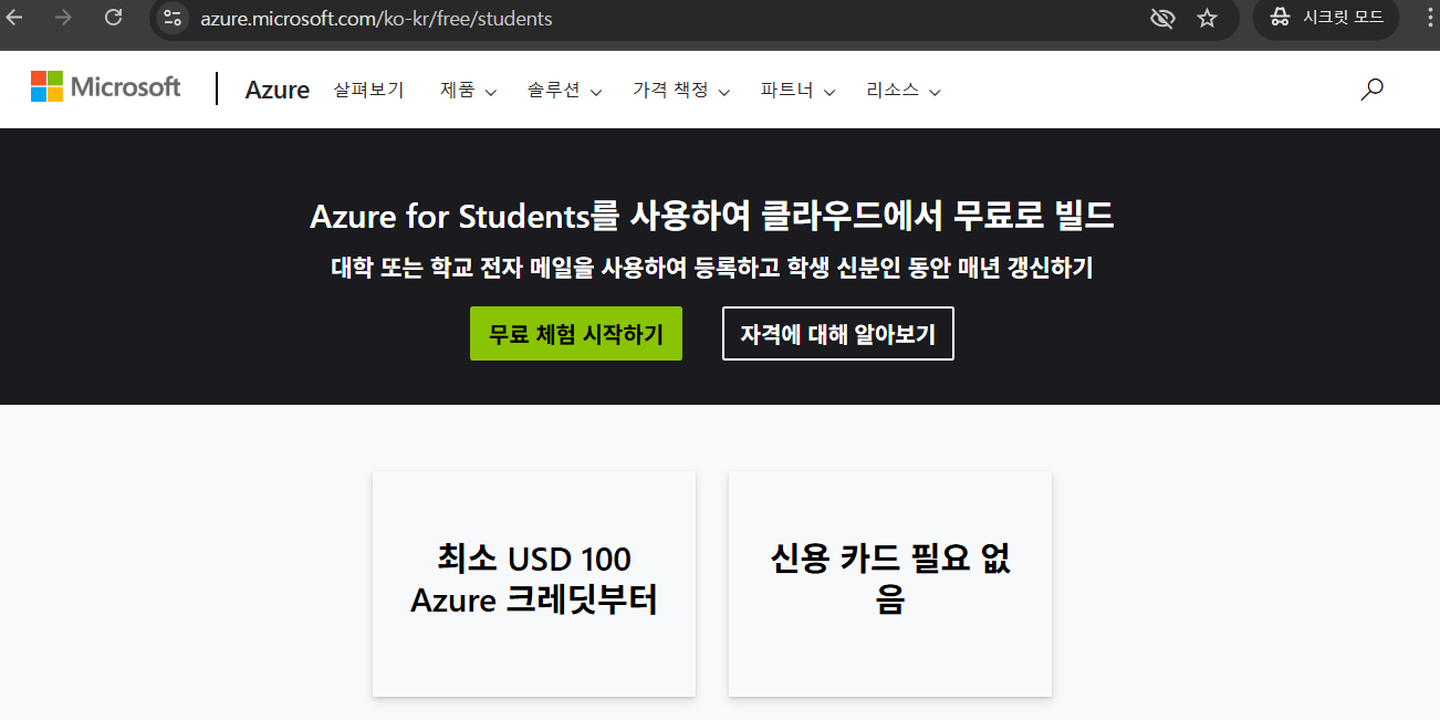 - Azure for Students → 무료 체험 시작하기 클릭.
