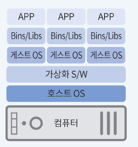 - 구조: 호스트 OS 위에 컨테이너 관리 소프트웨어 설치