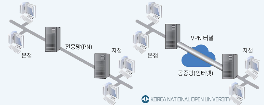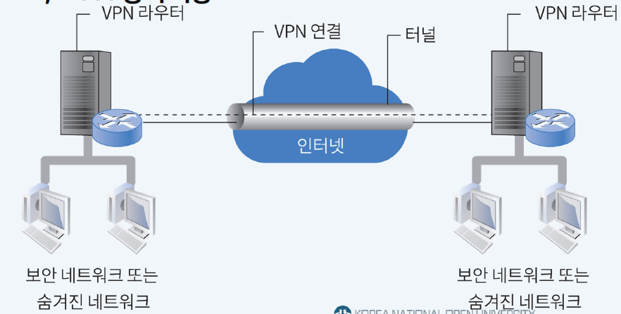 - 공용 네트워크에서 가상 전용선 효과 제공 - 터널링 기술(PPTP, IPsec 등)을 사용하여 데이터 암호화 및 전송 - PPTP: 2계층 터널링, TCP/IP 그대로 사용 가능 - IPsec: 3계층 보안 프로토콜, 인증 헤더와 암호화 기능 제공 |