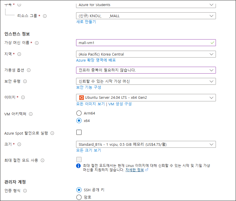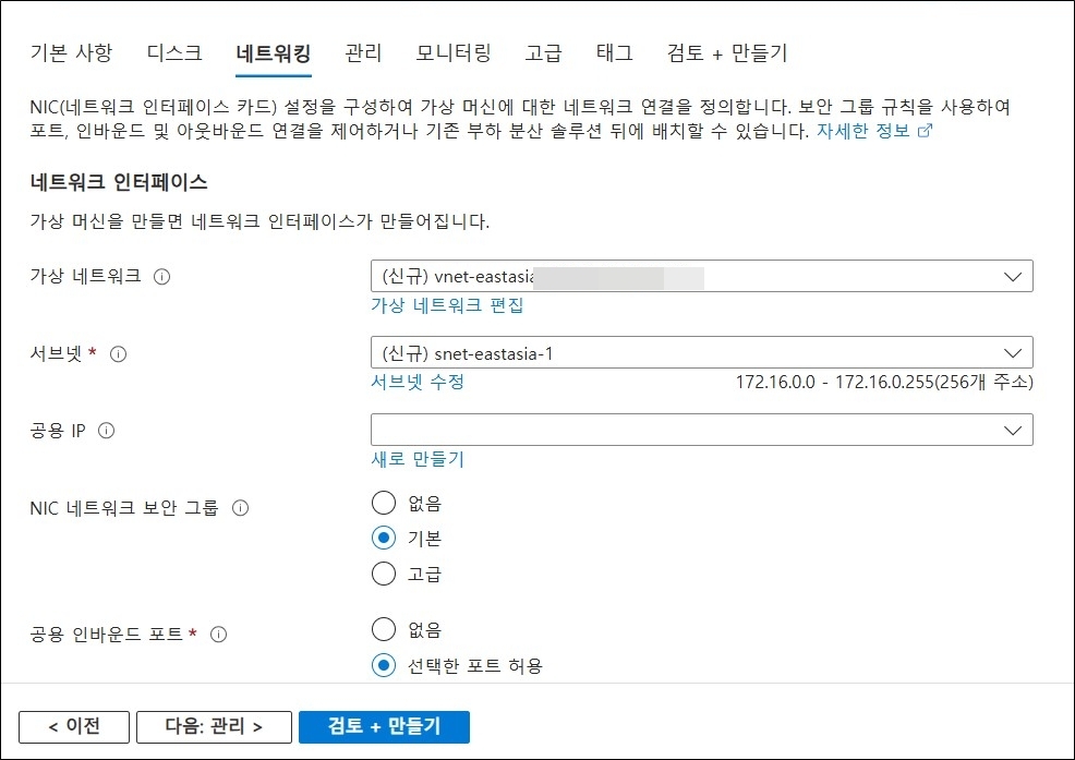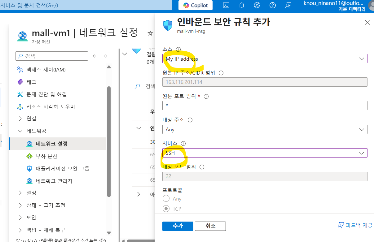 네트워킹 > 네트워킹 설정 > 규칙 > 포트 규칙 만들기 - 인바운드 포트 규칙 - 소스 'My IP address', 서비스 'SSH'