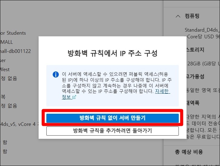 - 실습용에서는 “없음” 선택 (비용 절감용)