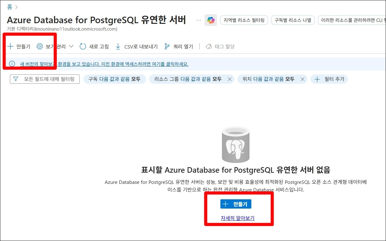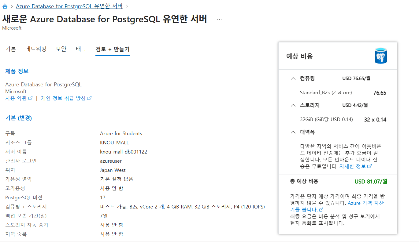- 인증: PostgreSQL 인증만 사용 (실습에서는 Azure AD 비활성)