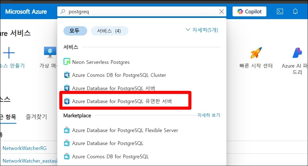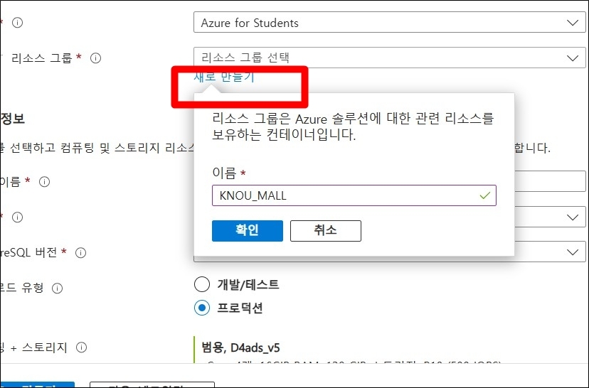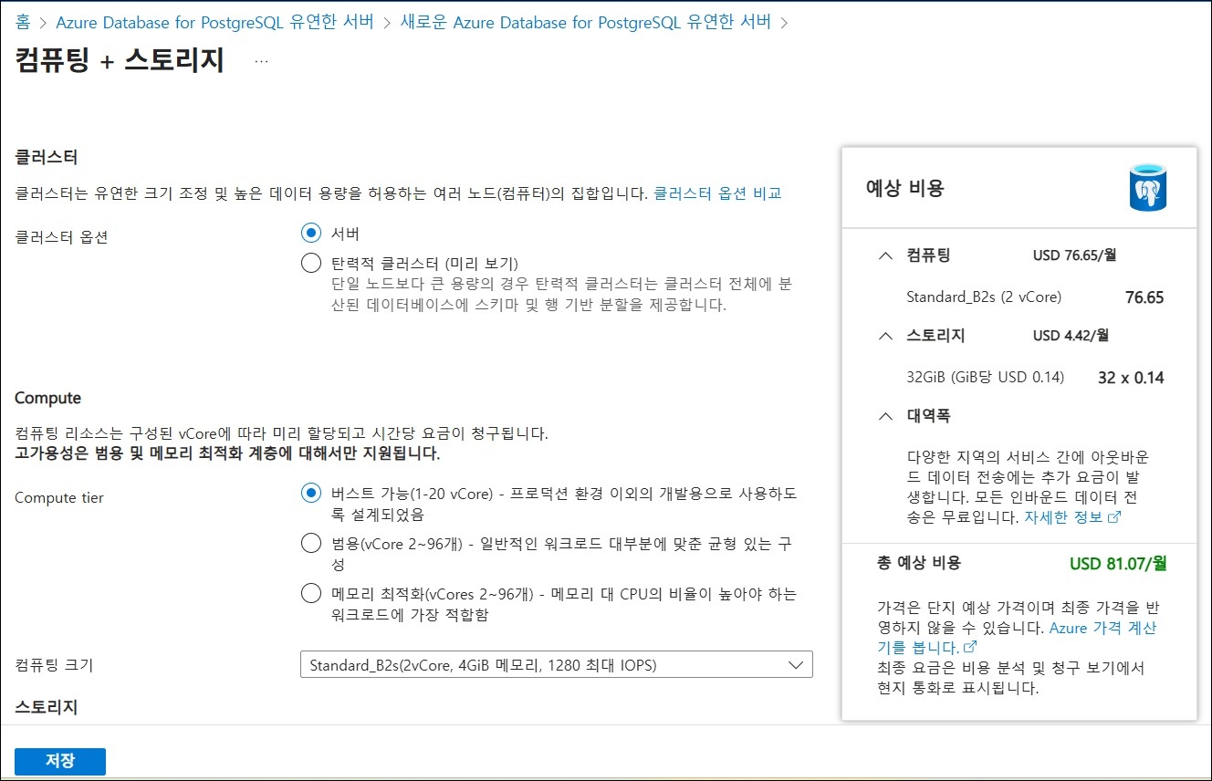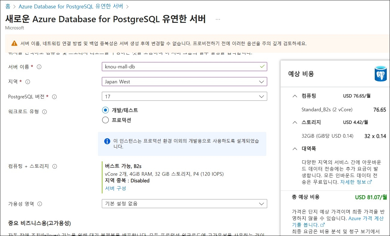 - 워크로드: 개발/테스트 (B1ms 자동 선택)