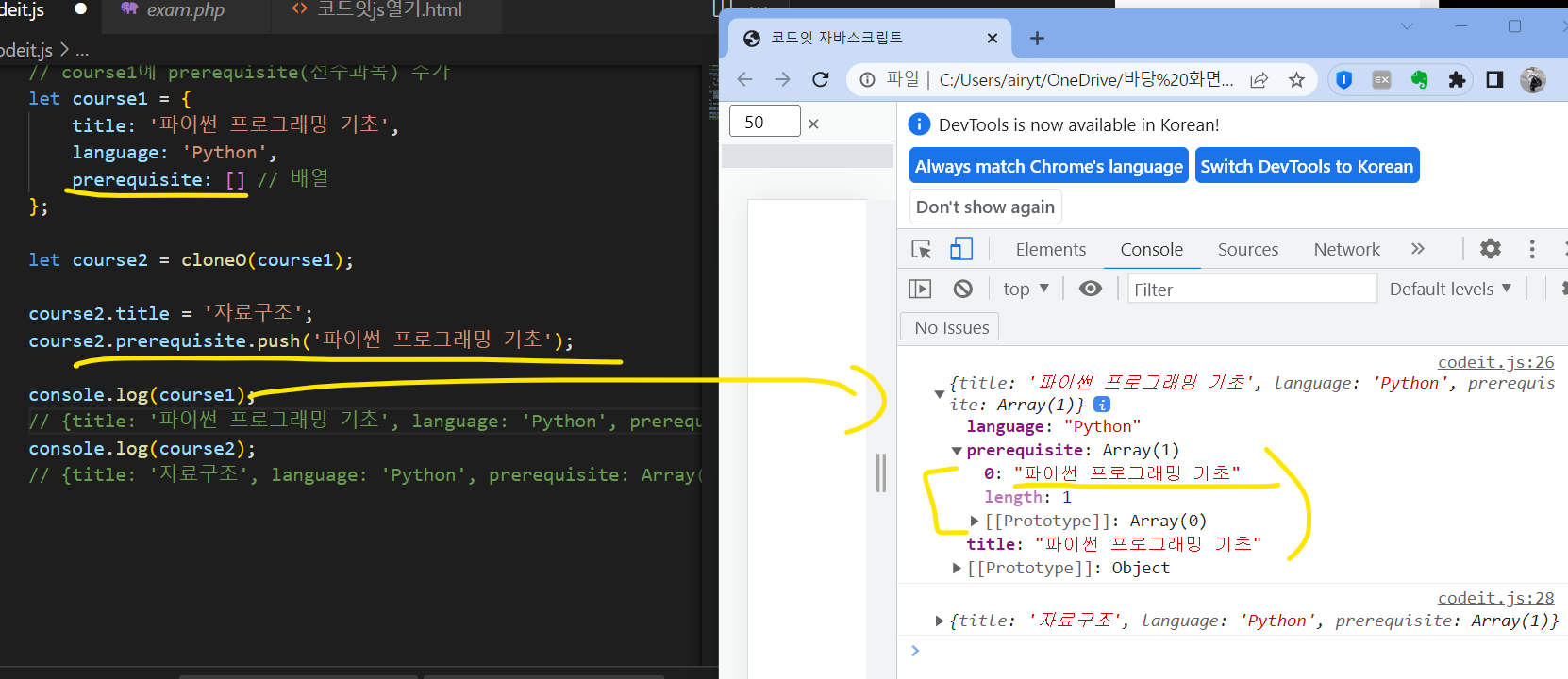 // cloneO 함수를 통해 course1의 프로퍼티가 course2에 복사됨.