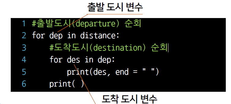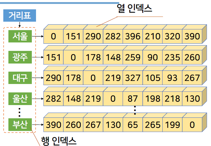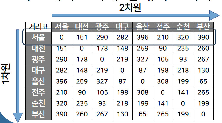| '거리표'라고 하는 2차원 리스트는 각 주요 도시의 값들을 리스트로 갖고 있고, 이 리스트의 값들이 나머지 도착 도시와의 거리에 해당되는 값을 가지고 있음. ·행 인덱스(row index) : 2차원 리스트의 왼쪽에서 오른쪽으로 이동 ·열 인덱스(column index) : 위에서 아래로 이동 각각의 인덱스는 0부터 시작하여 2차원 리스트의 길이보다 작은 값까지 사용 |