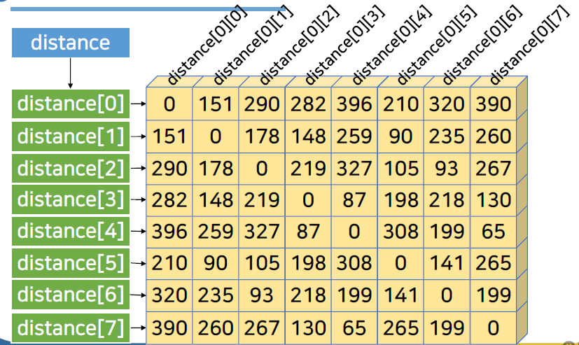 인덱스 항목은 내부 1차원 리스트를 가리키는 접근변수로 구성이 되어 있음. distance[0] : 0행 distance[0][7] : 0행 7열 → 390 두 개의 접근 연산자를 사용해 개별적인 값에 접근함. |