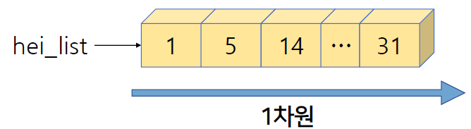리스트에 리스트가 내포된 즉, 리스트의 리스트 - 값들이 서로 매칭되어 일렬로 세울 수 없는 경우 - 2개의 차원 축이 생김. |