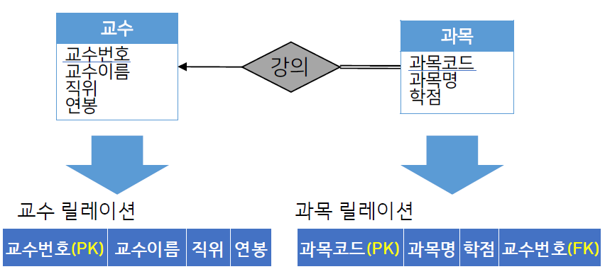 강의 관계집합은 교수 릴레이션(일)의 기본키인 교수번호를 과목 릴레이션(다)에 외래키(FK)를 생성하는 것으로 나타냄.