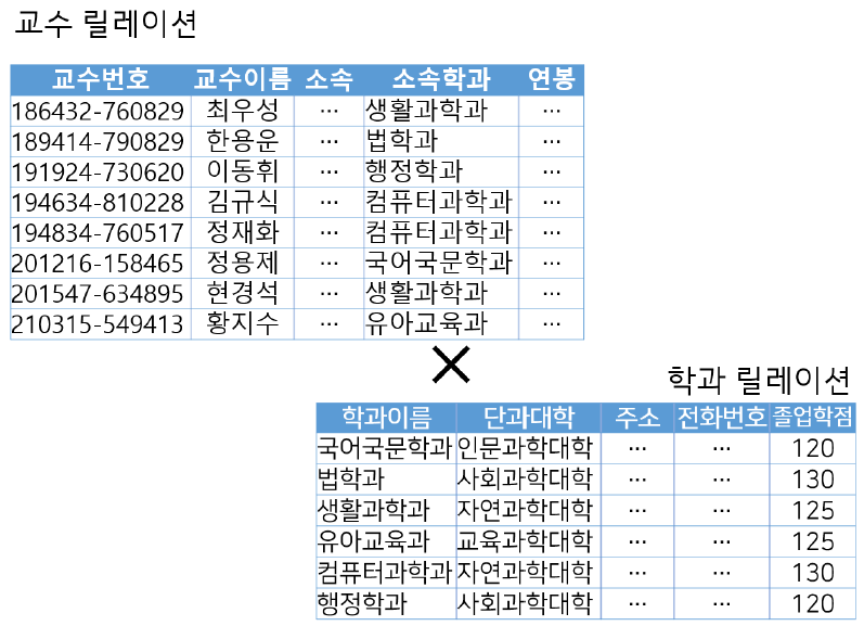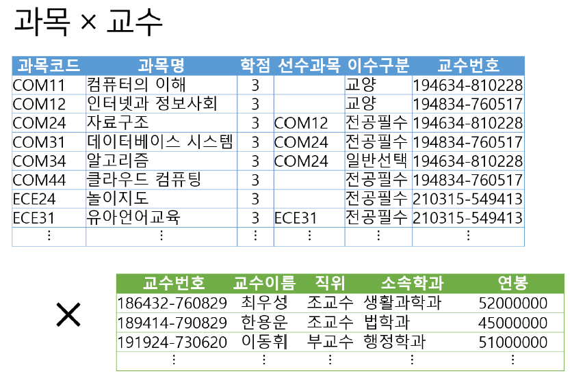 과목과 교수 두 릴레이션을 카티시언 프로덕트함. 과목과 교수 릴레이션의 모든 조합이 이루어짐. |