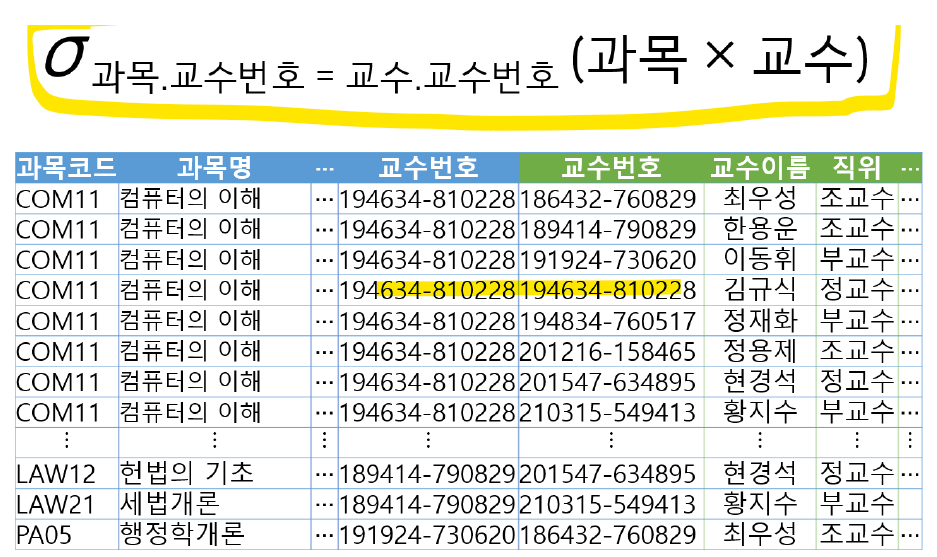즉, 과목 릴레이션과 교수 릴레이션을 카티시언 프로덕트 함. 과목의 교수번호와 교수의 교수번호가 같은 레코드만 셀렉트함. |