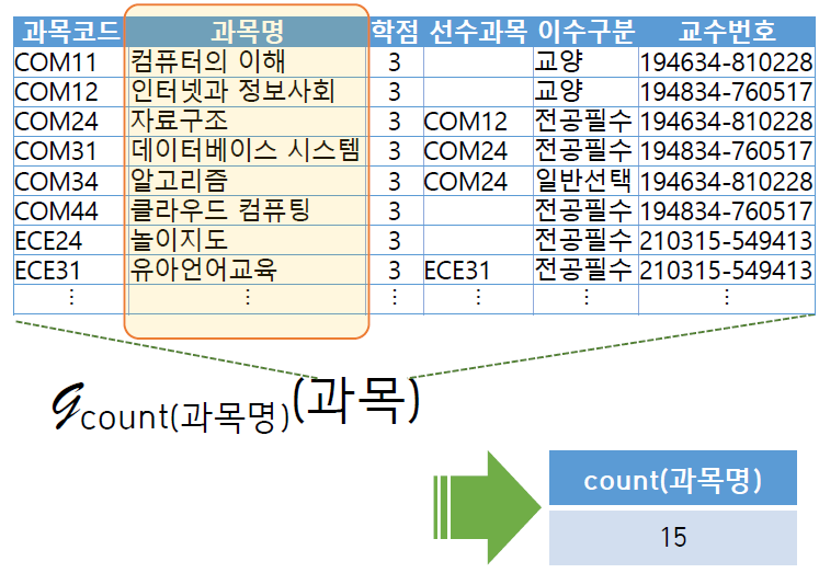 | 집계 함수를 값들의 집합 또는 레코드의 집합에 적용하는 연산 | 레코드 그룹화를 위해 집계 함수 연산자 앞에 그룹화 속성을 기술 |
