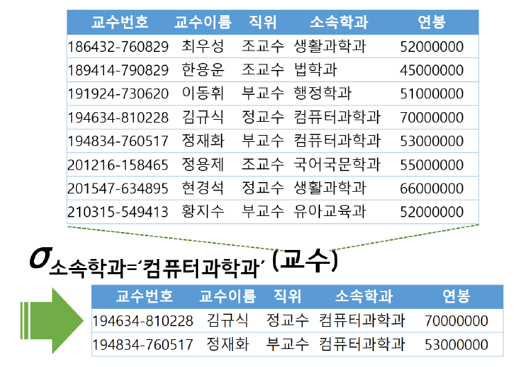 | 교수 릴레이션에서 소속학과가 컴퓨터과학과인 레코드만 추출 | 연봉이 5천만원 이상인(and) 교수 릴레이션에서 소속학과가 컴퓨터과학과인 레코드만 추출 |