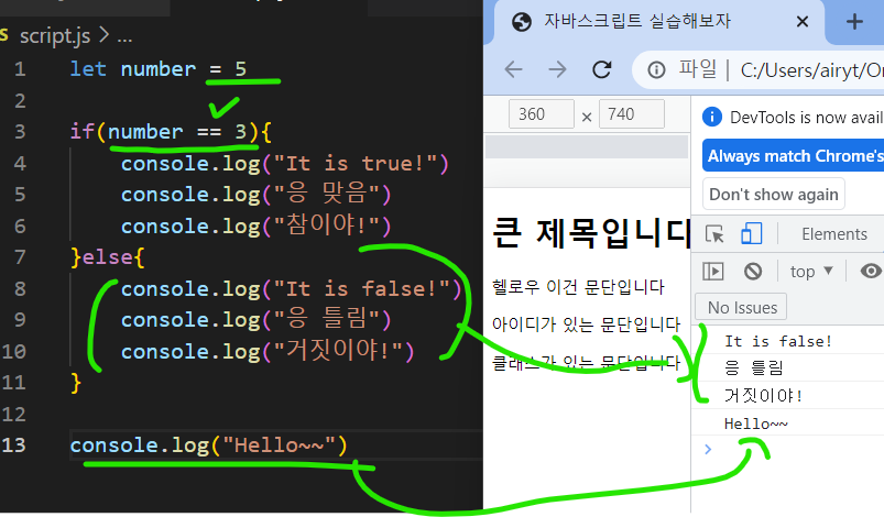 //조건이 false일 때 실행할 코드, else는 독립 사용 불가